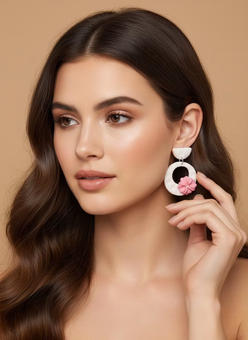 Monaco är ett lyxigt, vackert örhänge med vit bas, rosa blomma och romantisk textur. Perfekt för sommarens alla dagar!
