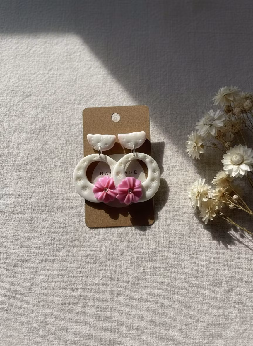 Monaco är ett lyxigt, vackert örhänge med vit bas, rosa blomma och romantisk textur. Perfekt för sommarens alla dagar! Örhängesmodell: stift.
