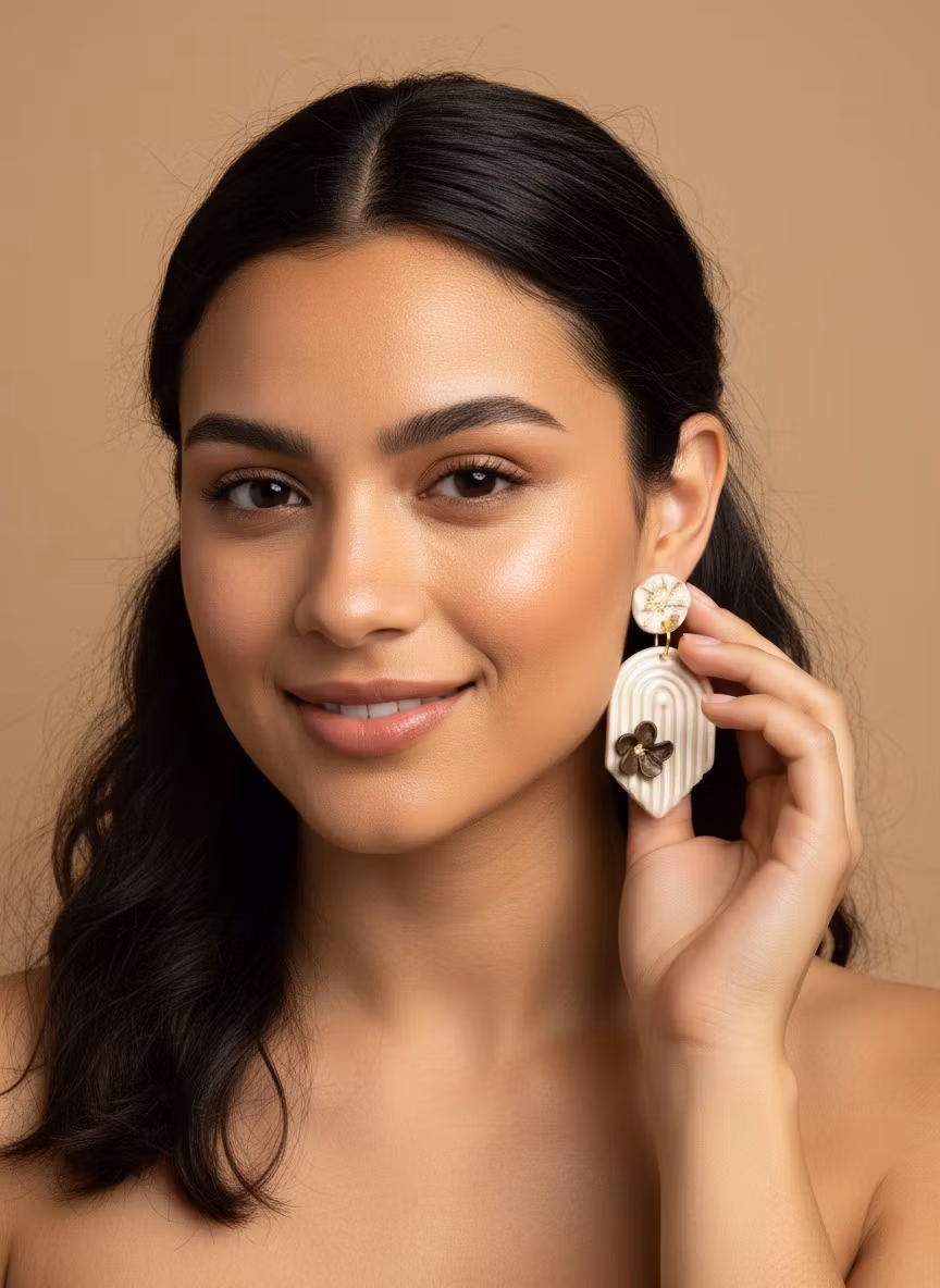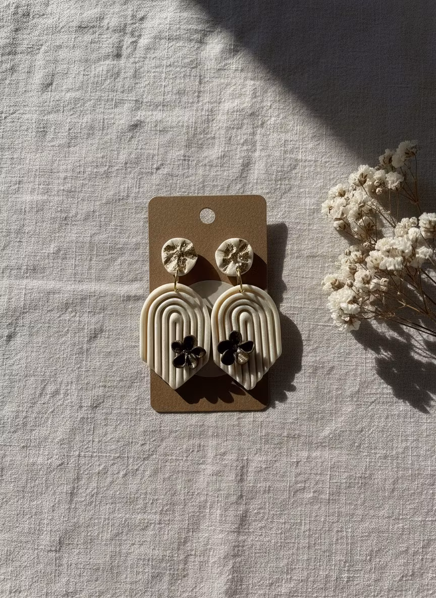 Stort, rustikt örhänge med karaktär som ändå är lätt att bära och matcha med sina jordnära färger. En brunfärgad blomma och guldfoliedetaljer på offwhite-bas.