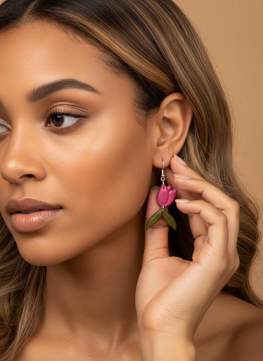 Rosa vacker hängande tulpan med gröna blad! Örhängesmodell: krok.