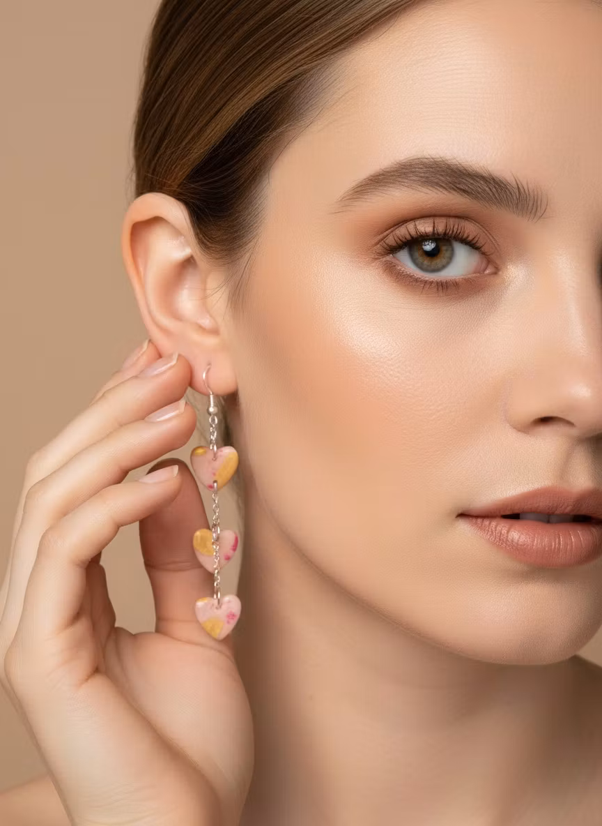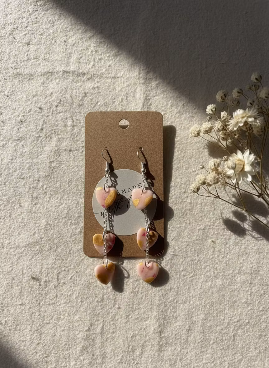 Ett vackert örhänge med tre melerade hjärtan i fall. Sitter på silverfärgad kedja.Örhängesmodell: krok.