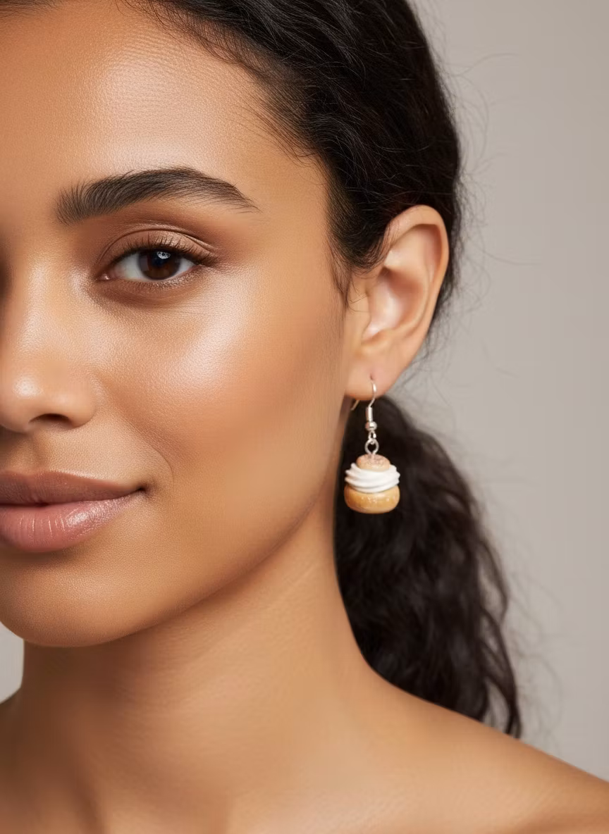 Ett väldigt gulligt örhänge i form av minatyr-semla! Handmålad och glaserad för att få till en riktigt söt och realistisk look. Varför bara äta fika när man kan njuta av den på så många fler sätt?