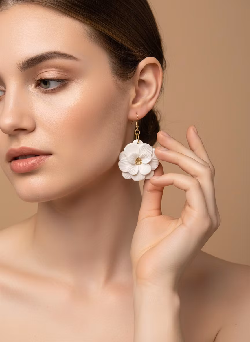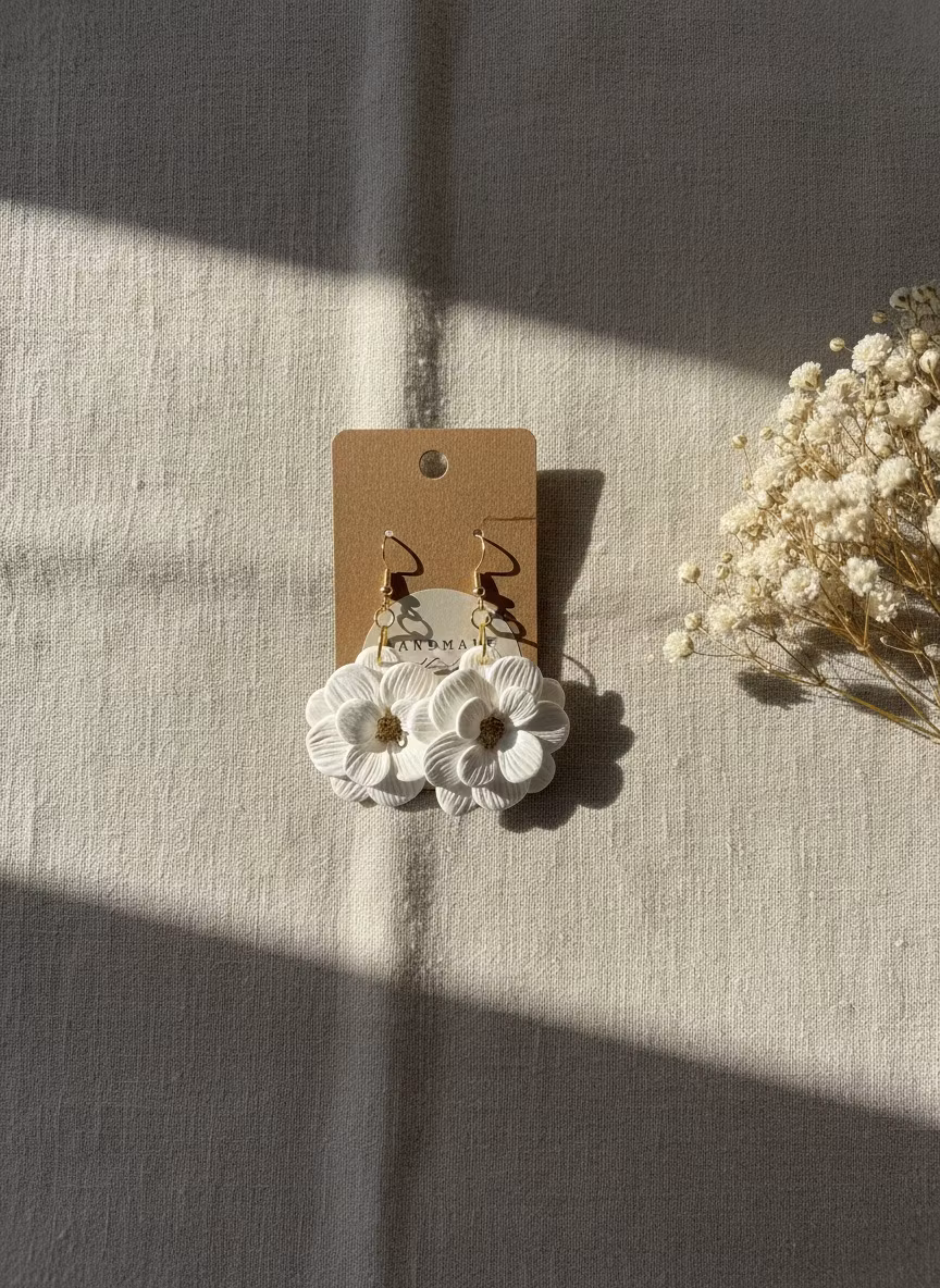 Ett stort elegant örhänge med romantiskt uttryck. Vacker blomma i vitt med guldfärgade detaljer inuti.